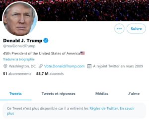 - Suppression du compte Twitter de Trump : une apologie des sites webDonald Trump a vu son compte Twitter définitivement supprimé. Un coup de tonnerre qui rappelle combien les bons vieux sites web ont quelques avantages…